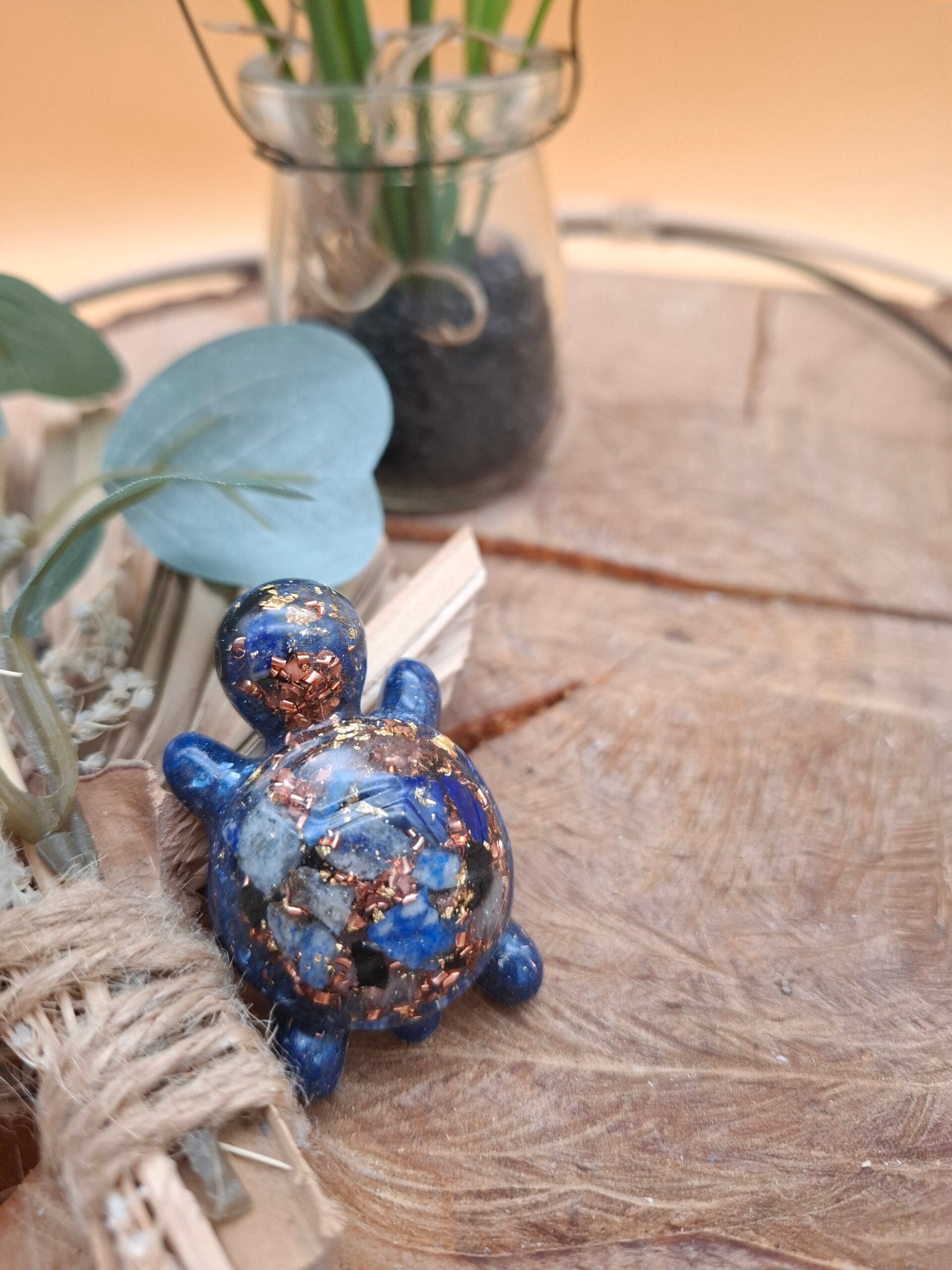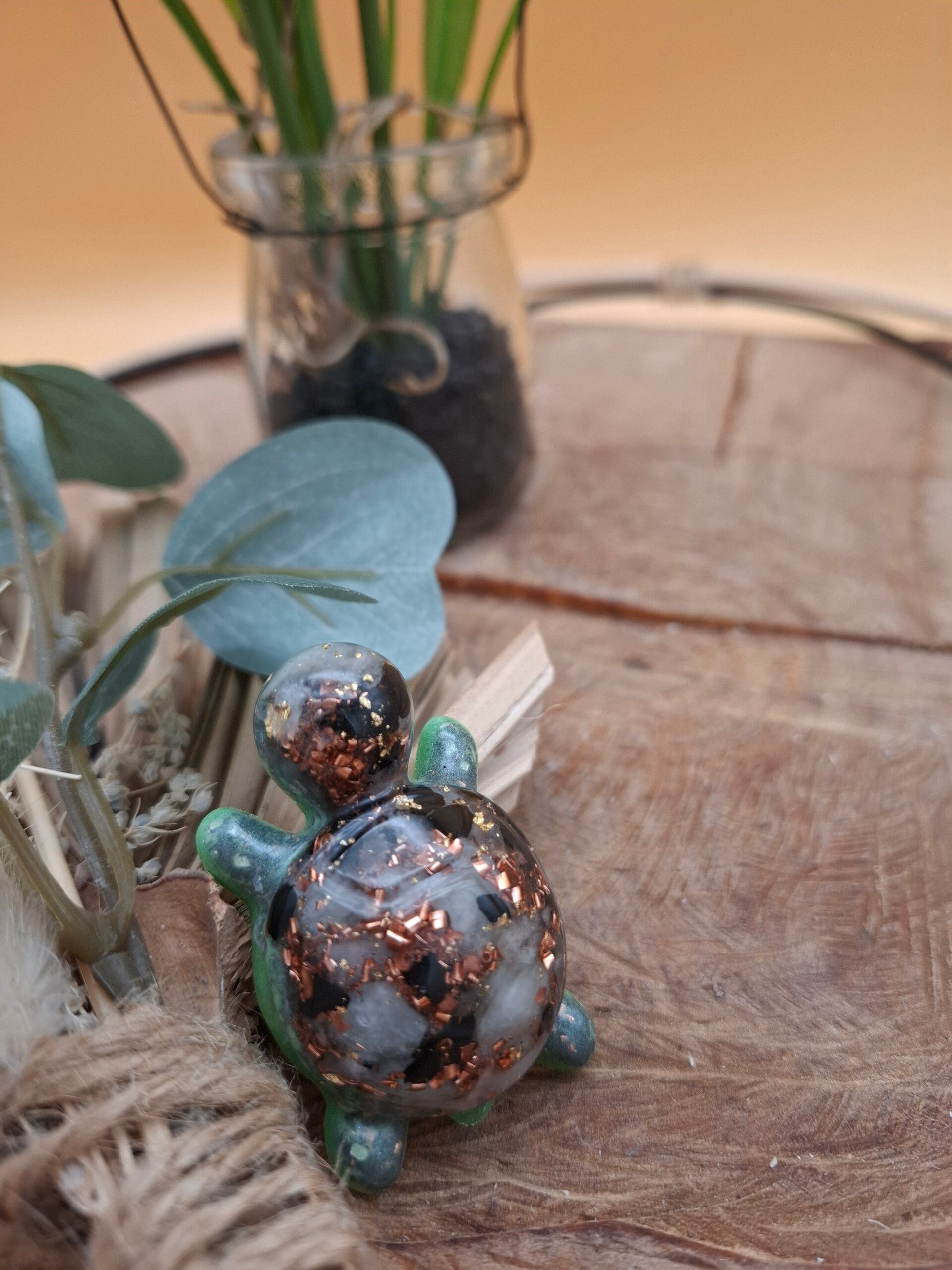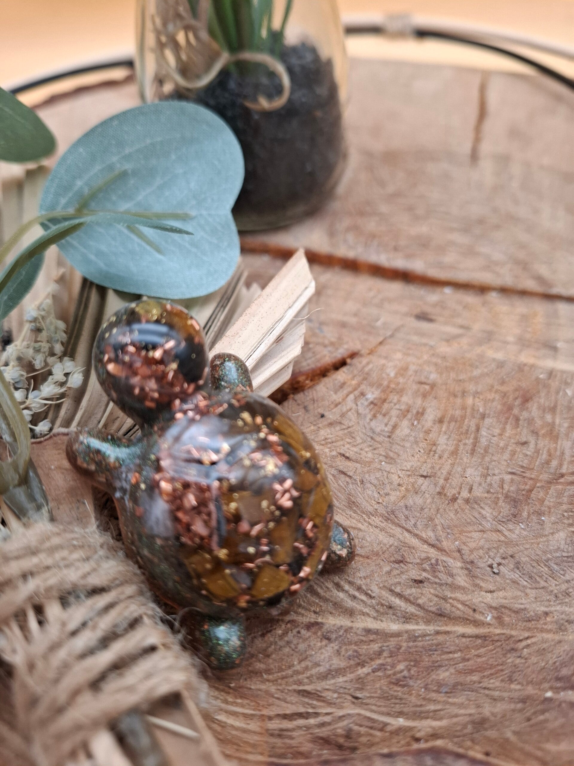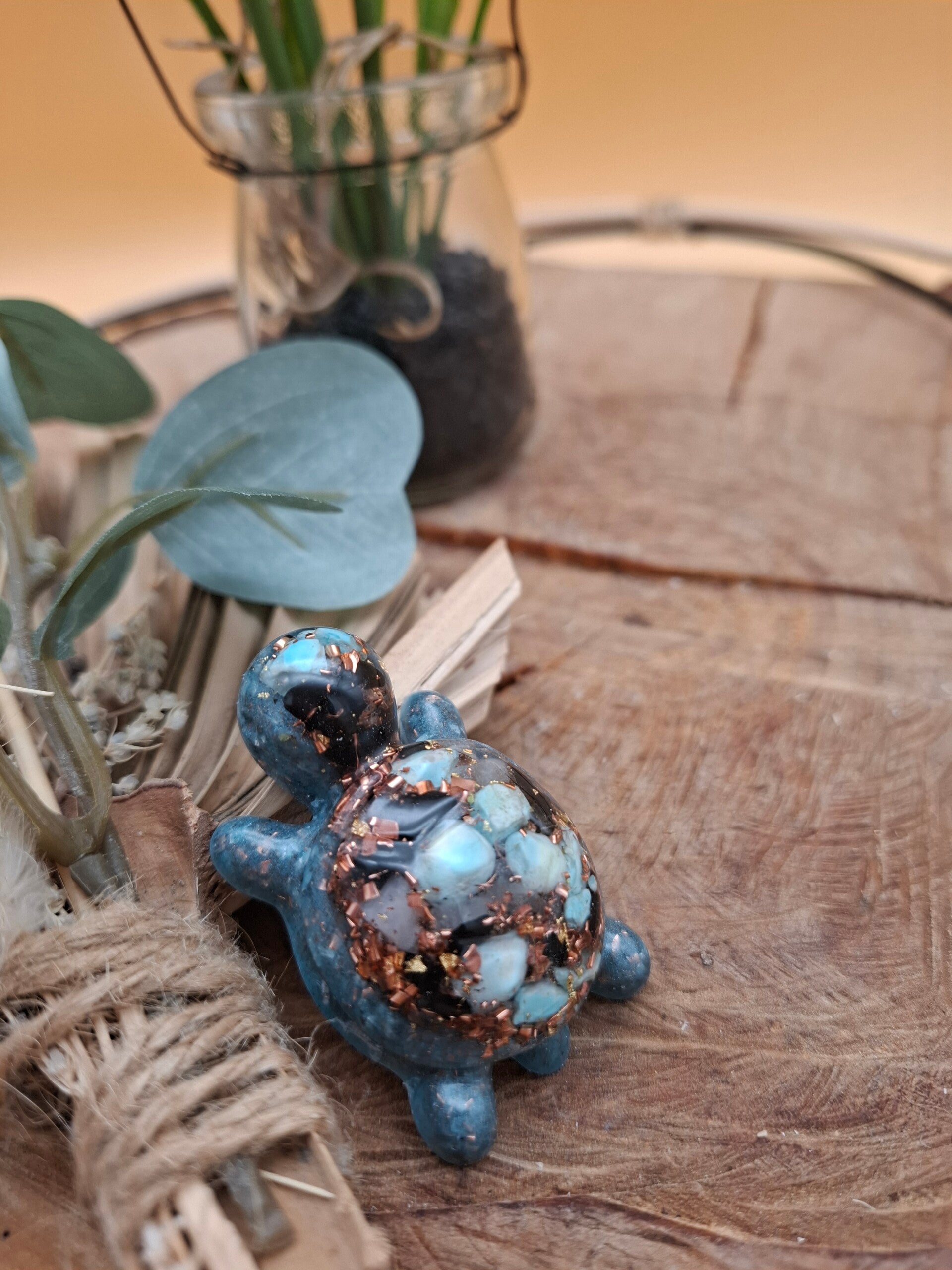 Keine Schildkröte gleicht der anderen – durch die einzigartige Komposition aus Harz, Kristallen (wie Smaragd, Rubin, Lapislazuli, Mondstein, Apatit), Shungit und Bergkristall, sowie verschiedenen Metallen, wie zum Beispiel Kupfer, entsteht jedes Mal ein neues kleines Kunstwerk.