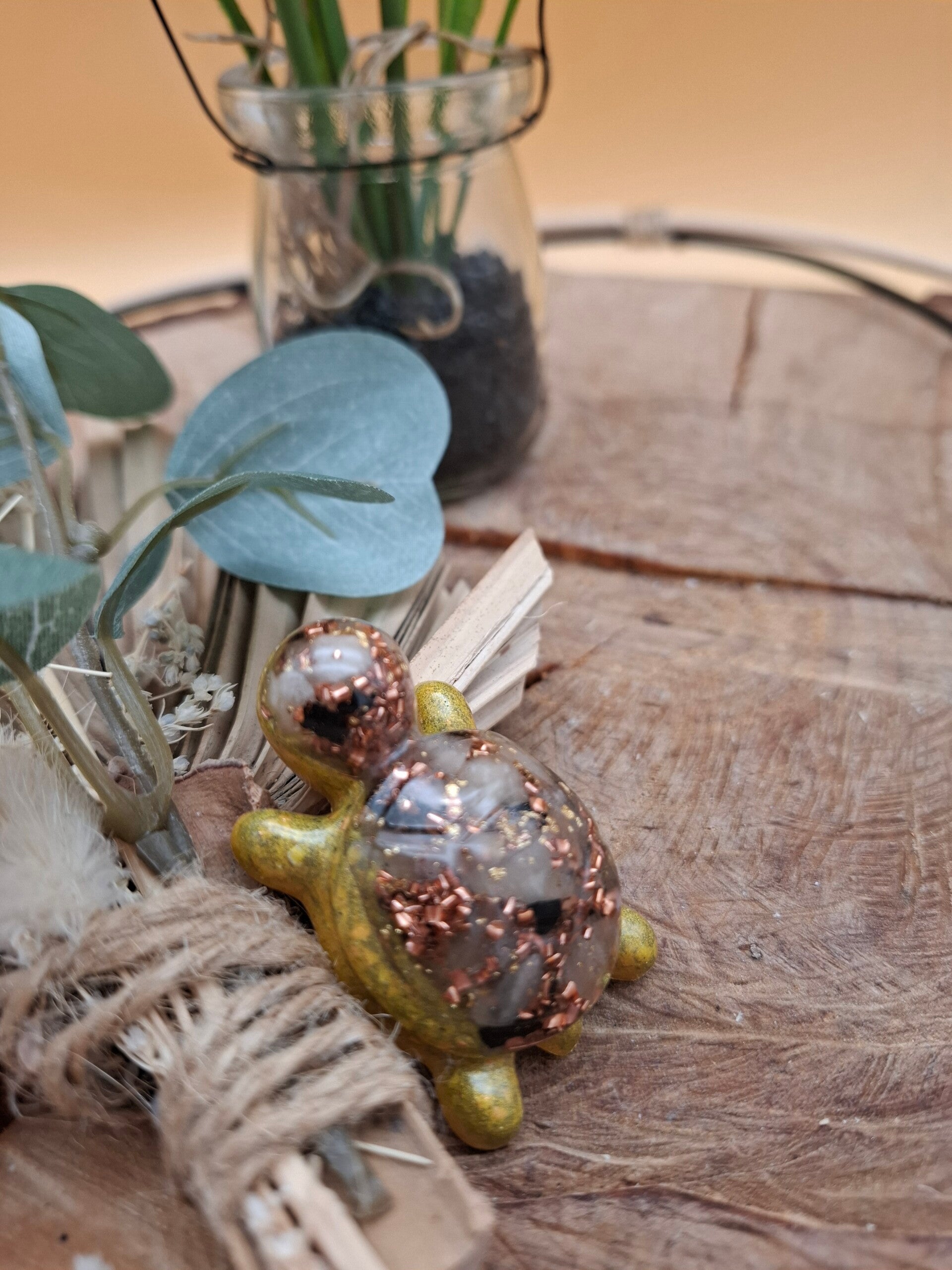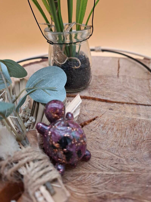Unsere kleinen Orgonit-Schildkröten sind mehr als nur hübsche Deko – sie sind liebevoll gefertigte Energiehelfer, die Harmonie, Schutz und innere Ruhe in dein Zuhause bringen. Jede Schildkröte wird von Hand gegossen und mit sorgfältig ausgewählten Edelsteinen, Metallspänen und Harz gefertigt – nach dem klassischen Prinzip des Orgonits.